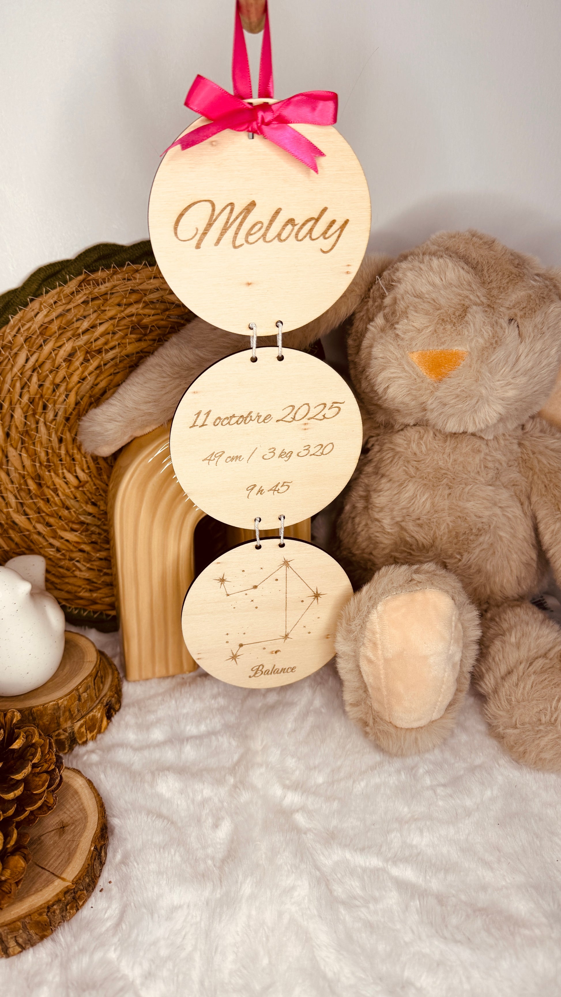 Célébrez l’arrivée de votre petit trésor avec cette décoration de naissance en bois personnalisée, composée de trois cercles suspendus les uns sous les autres. Une création pleine de tendresse, idéale pour garder un souvenir unique des premiers instants de bébé.