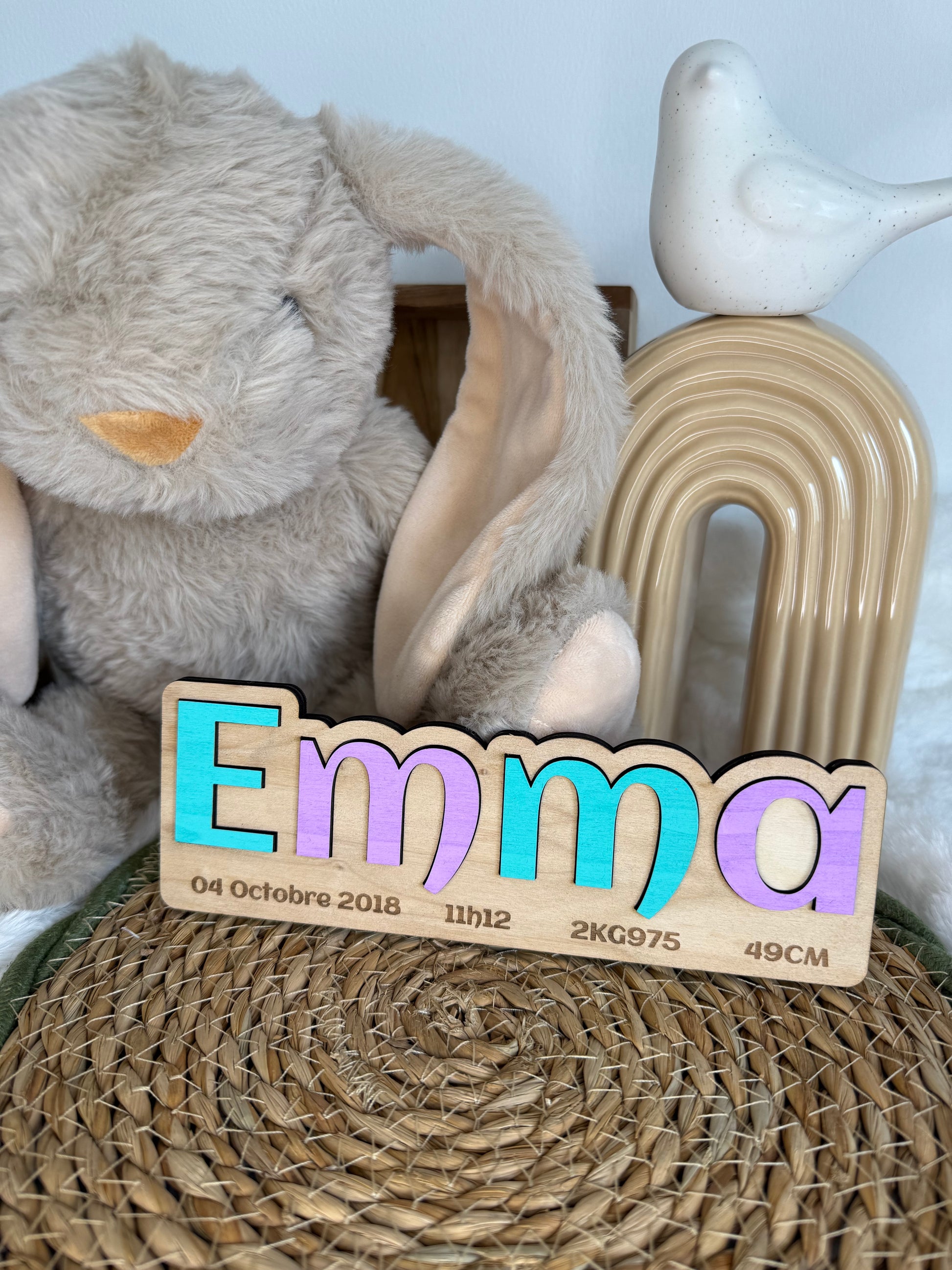 Chaque panneau est entièrement fait sur mesure avec le prénom de votre enfant et ses informations de naissance :